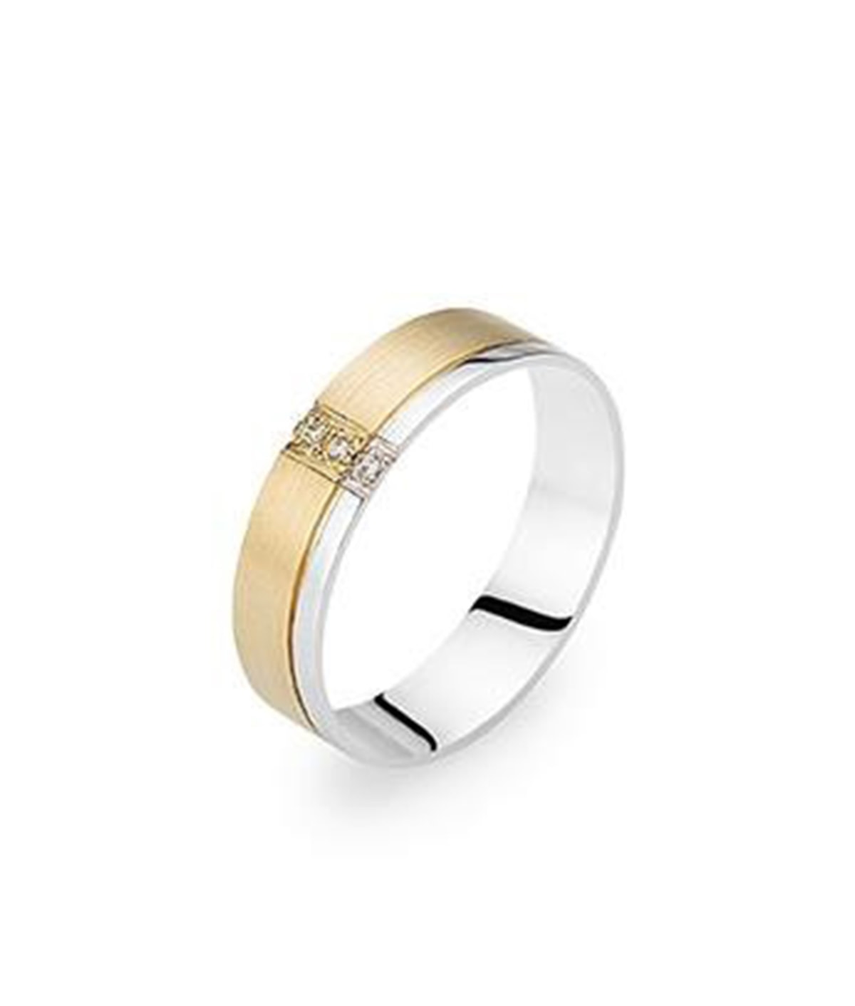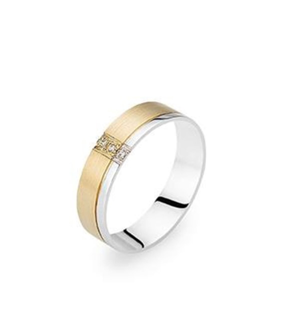 Aliança anilha amendoada acetinada com friso lateral polido e três zircões cravados na transversal