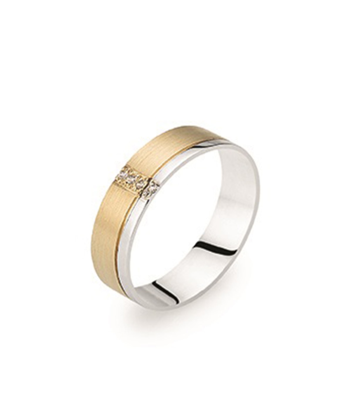 Aliança anilha amendoada acetinada com segmento lateral polido e quatro zircões cravados na transversal