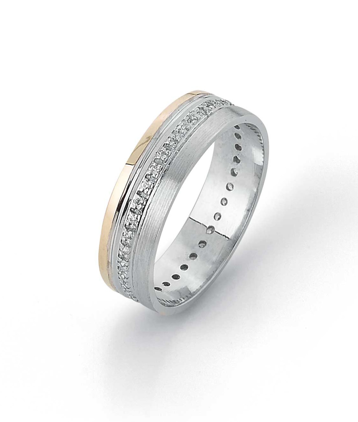 Aliança anilha amendoada acetinada com fila de zircões em toda a volta e friso lateral polido