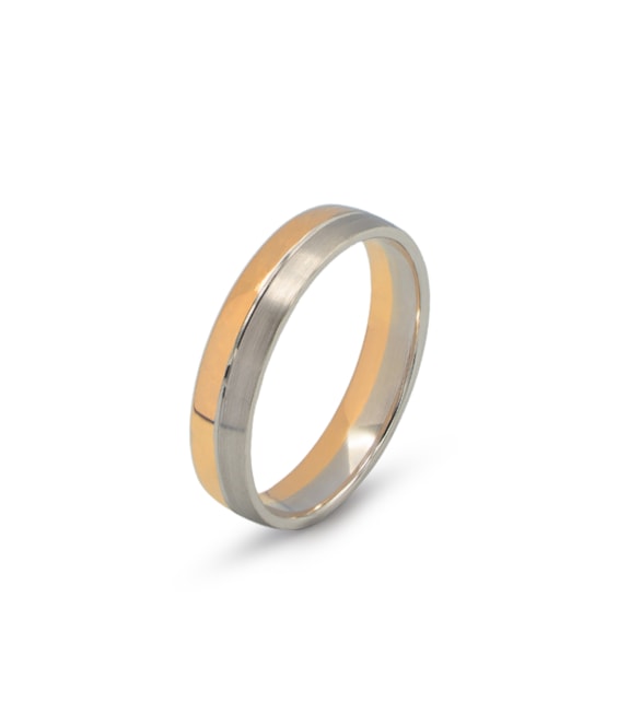 Aliança meia cana amendoada polida e acetinada com friso em v central