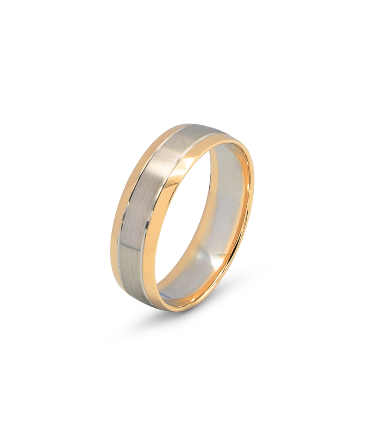 Aliança meia cana amendoada com friso largo central acetinado e um friso estreito de cada lado polido