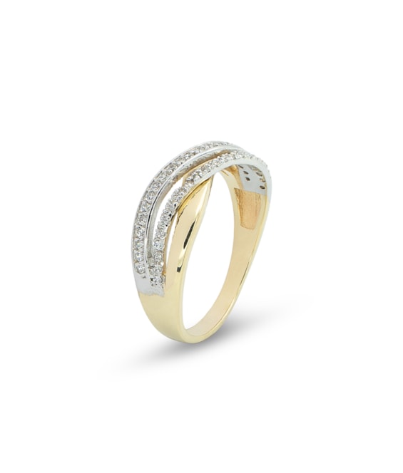 Anel cruzado com duas filas de zircões sobrepostas e uma polida