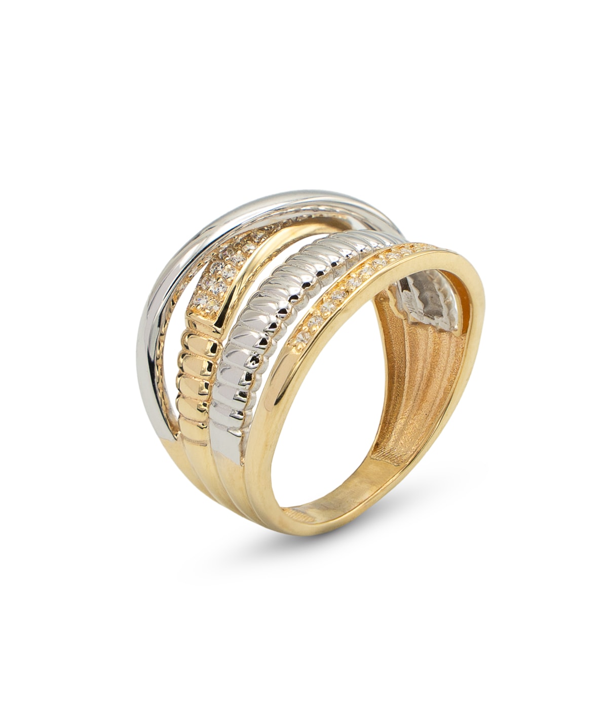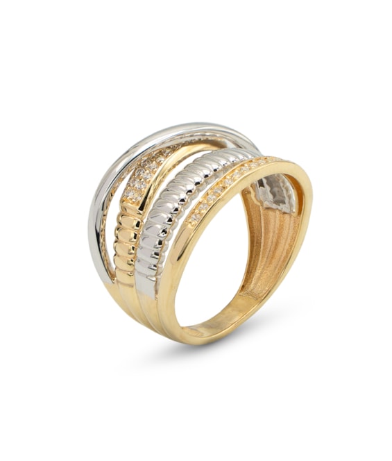 Anel com duas filas de zircões, uma segmentada ao centro e outra sobreposta