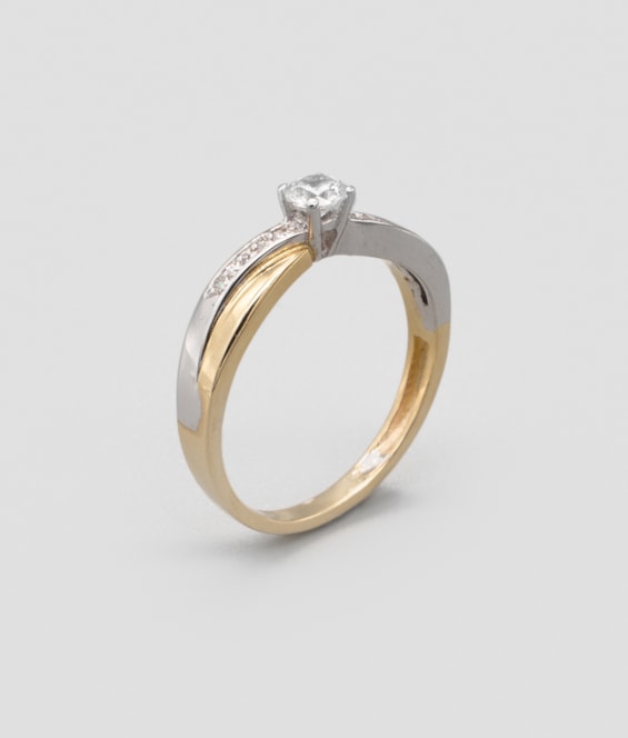 Anel solitário com zircão redondo central com quatro garras e zircões nas laterais em sentidos opostos
