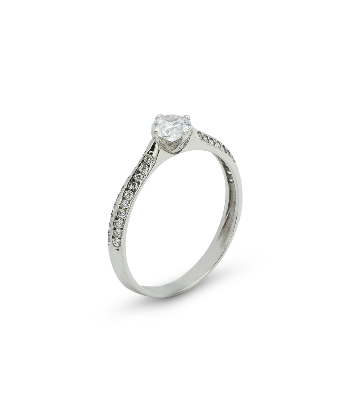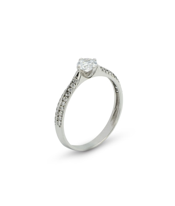 Anel solitário com zircão redondo central com quatro garras e dupla fila de zircões de cada lado do aro