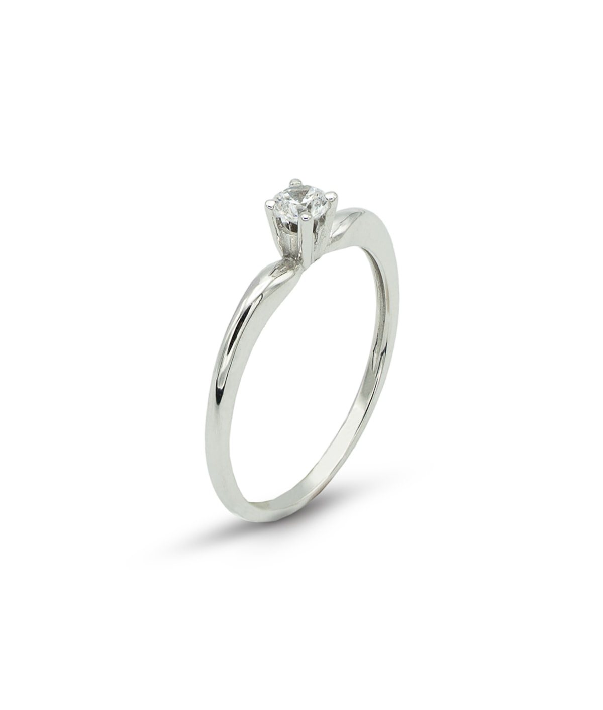 Anel solitário com zircão redondo central com quatro garras e aro curvo no topo