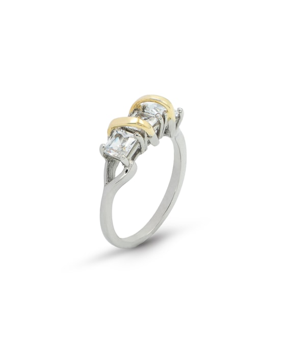 Anel com três zircões quadrados com quatro garras cada um e fois filamentos de ouro amarelo sobrepostos
