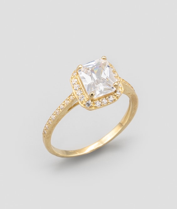 Anel com zircão retangular central com quatro garras e zircões à volta da mesma e no aro